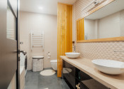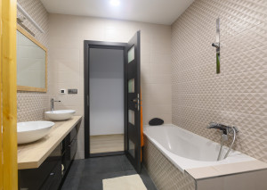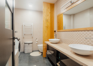 Jedná sa o kvalitnú stavbu, kde ohrev teplej vody je zabezpečený elektrickým ohrievačom, rovnako aj podlahové vykurovanie je elektrické.
