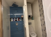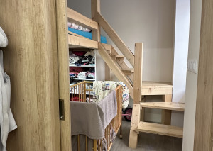 V spálni je vyvýšená posteľ, čím sa vytvoril veľký odkladací priestor. Kúpeľňa je spojená s toaletou.