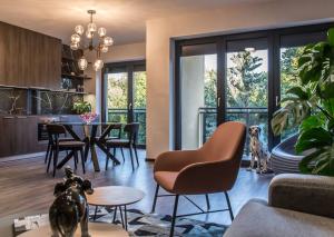It is located in the most lucrative location of Košice, directly in the City Park in a new building (Mestsky Park Residence) approved in 2019 with elevator and a garage parking place next to the apartment. The prestigious apartment on the top floor with an area of 88 m2 offers a spacious living room with a kitchen and a dining area, two separate bedrooms with wardrobes, a bathroom with a bathtub and a toilet, and a separate guest toilet with a sink in the hallway. The balcony is oriented to the park and offers a wonderful view and privacy. Hlavná Street is a few minutes walk from this apartment. The apartment is fully furnished with underfloor heating and own hot water heating, T-com optical internet , air condition.