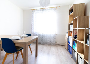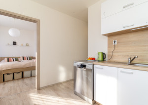 V celom byte je plávajúca podlaha, pričom predsieň je riešená dlažbou pre praktické využitie. Oblôžkové zárubne a dvere dotvárajú moderný vzhľad interiéru. V predsieni je navyše znížený strop, ktorý dodáva priestoru útulnosť. Kúpeľňa je vybavená vaňou, pričom WC je samostatné, čo zvyšuje komfort bývania. Priestranná kuchyňa ponúka dostatok miesta na pohodlné varenie a stolovanie.