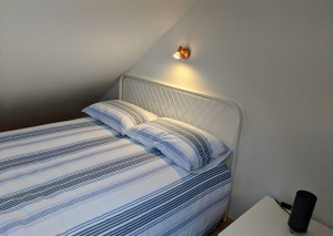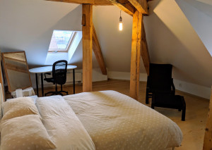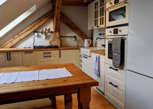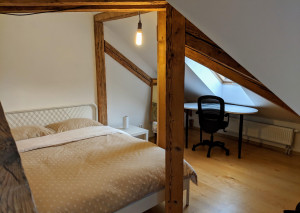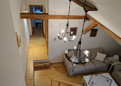 Veľkolepý vzdušný priestor – Dominantou bytu je otvorená obývačka s možnosťou napojenia krbu na komín a s kompletne zariadenou kuchyňou, ktorá vytvára nádherný, presvetlený priestor ideálny na spoločné chvíle aj relax. Kuchyňa je vybavená stavanými spotrebičmi (kávovar, umývačka riadu, mikrovlná rúra, elektrická rúra, plynový sporák, chladnička s mrazničkou). Za obývačkou sa nachádza priestranná kúpeľňa, ktorá ponúka dostatok miesta pre pohodlie a relaxáciu. Veľká spálňa + útulná detská izba – Na hlavnom podlaží sa nachádza veľká spálňa, ktorá ponúka pokoj a súkromie. Na poschodí je umiestnená menšia detská izba, ktorá môže slúžiť aj ako pracovňa či hosťovská izba.
