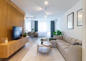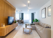 Priestranná obývacia izba je srdcom bytu a miestom, kde sa budete cítiť skutočne komfortne. Vďaka svojej veľkosti a otvorenému prepojeniu s kuchyňou a jedálňou vytvára pocit vzdušnosti a slobody. Je dokonale presvetlená denným svetlom, ktoré sem prúdi cez veľké okná orientované na východ a západ. V obývačke nájdete dostatok priestoru na relaxačnú zónu s pohodlnou sedačkou aj jedálenský stôl, kde môžete tráviť chvíle s rodinou či priateľmi.