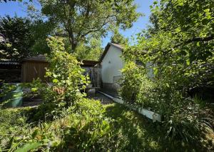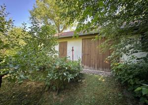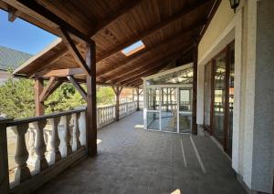 Z obývacej časti je krytá terasa a výstup do záhrady na ktorej zadnom konci sa nachádza záhradný domček slúžiaci ako vínna miestnosť. Na záhrade sú okrasné dreviny a stromy.