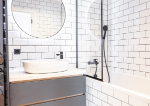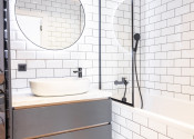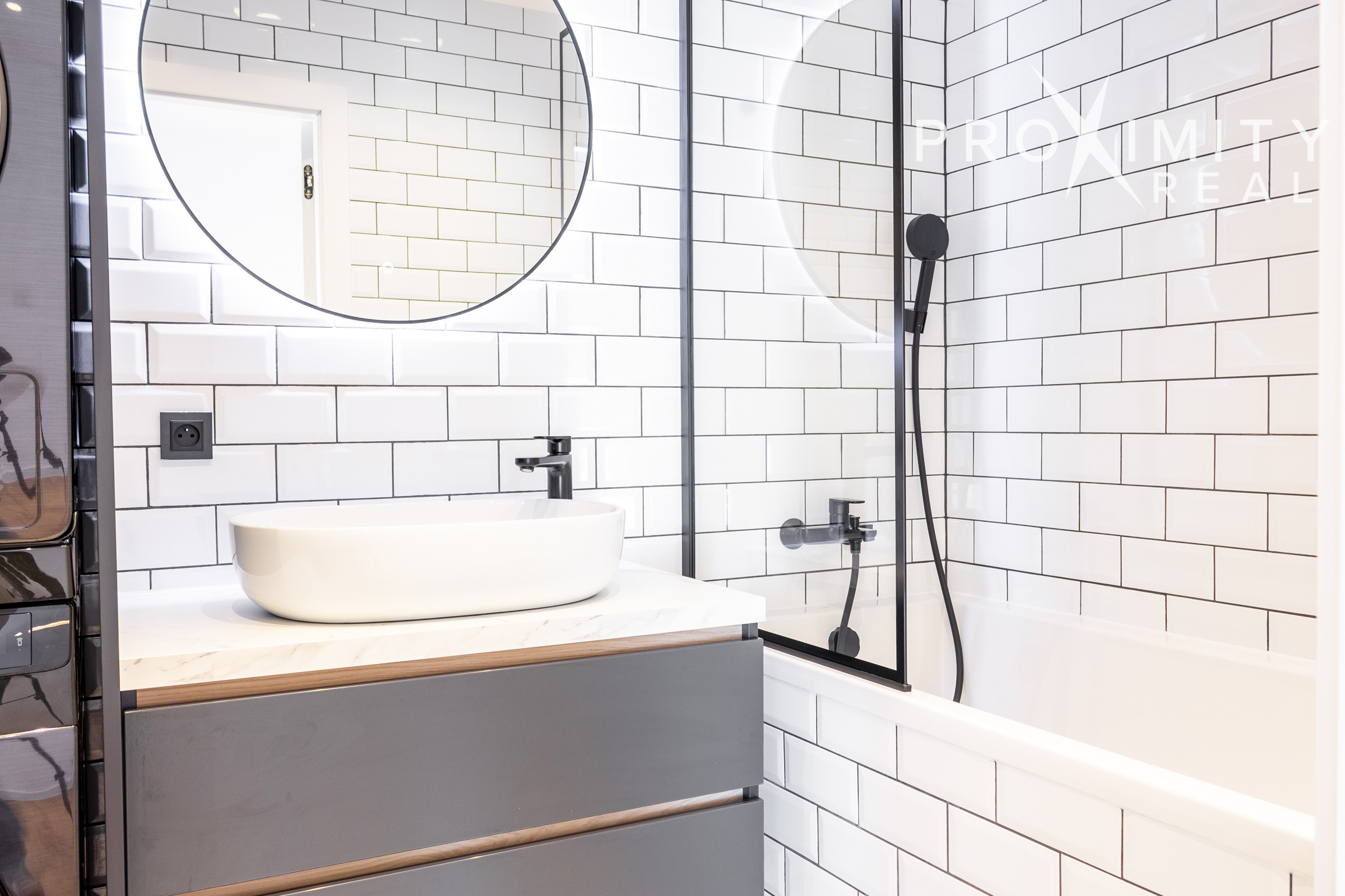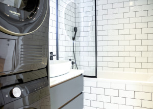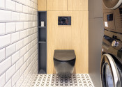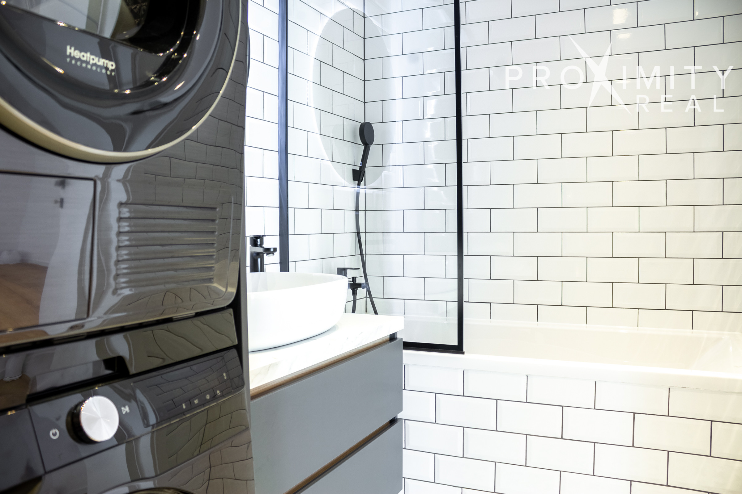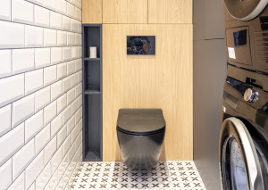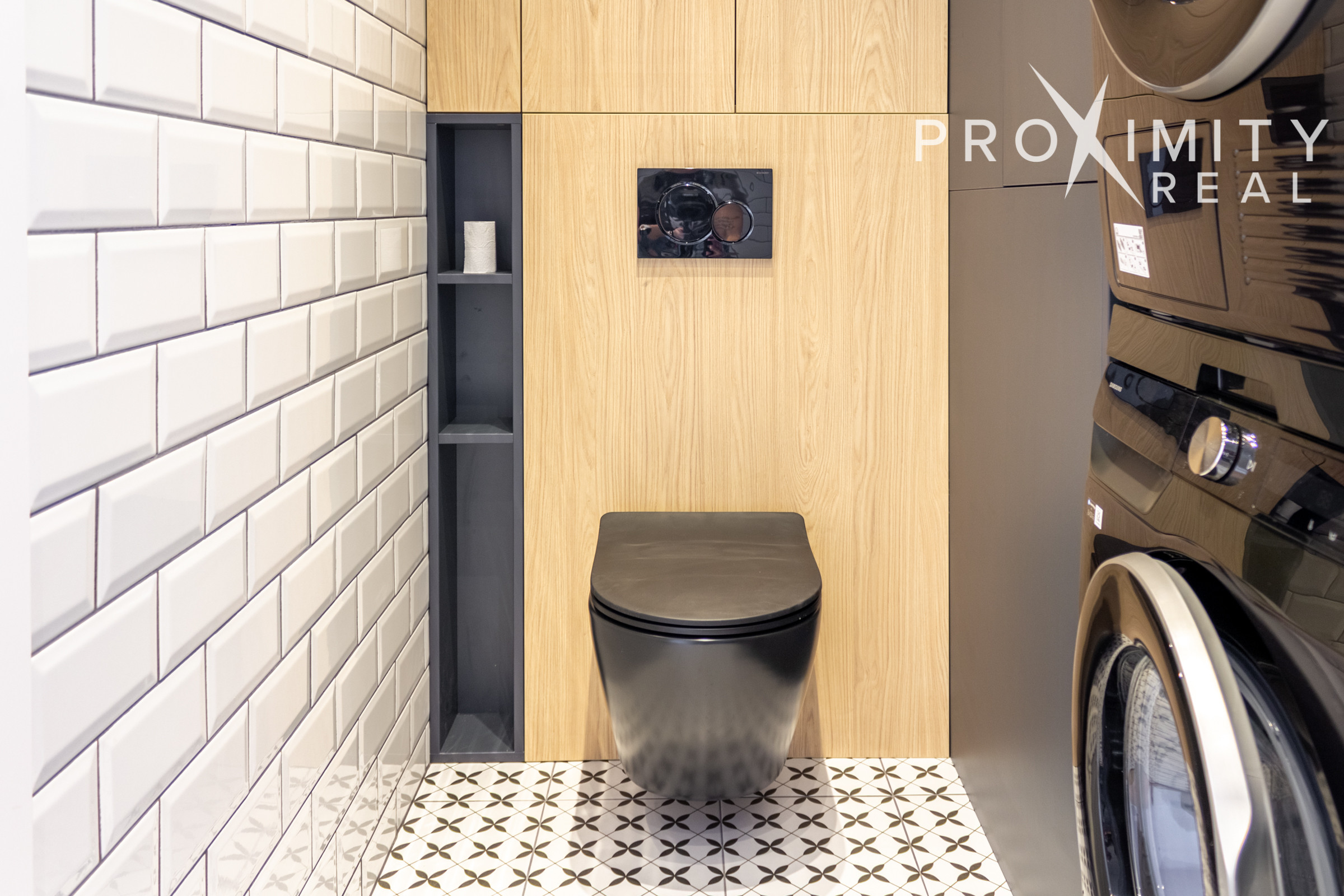 Kúpeľňa spojená s WC je navrhnutá v čistom, elegantnom štýle. Nachádza sa tu vaňa s bočným skleneným panelom, čierne WC značky Geberit, kvalitné batérie Hansgrohe, podsvietené zrkadlo a množstvo úložného priestoru v zabudovaných skrinkách. Súčasťou kúpeľne je aj práčka a sušička značky Samsung, ktoré sú elegantne integrované do nábytku, aby nič nenarúšalo estetiku priestoru.