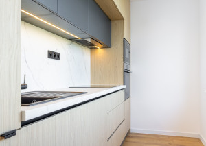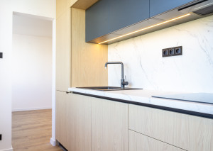 Kuchynská linka na mieru je kombináciou elegancie a praktickosti. Je vybavená vstavanými spotrebičmi značky Bosch (rúra, mikrovlnná rúra, elektrická varná doska), doplnená o drez a batériu značky Blanco a vstavanú chladničku s umývačkou riadu Beko. Priestor dotvára bodové osvetlenie a podsvietenie linky, ktoré dodávajú kuchyni moderný a útulný vzhľad.