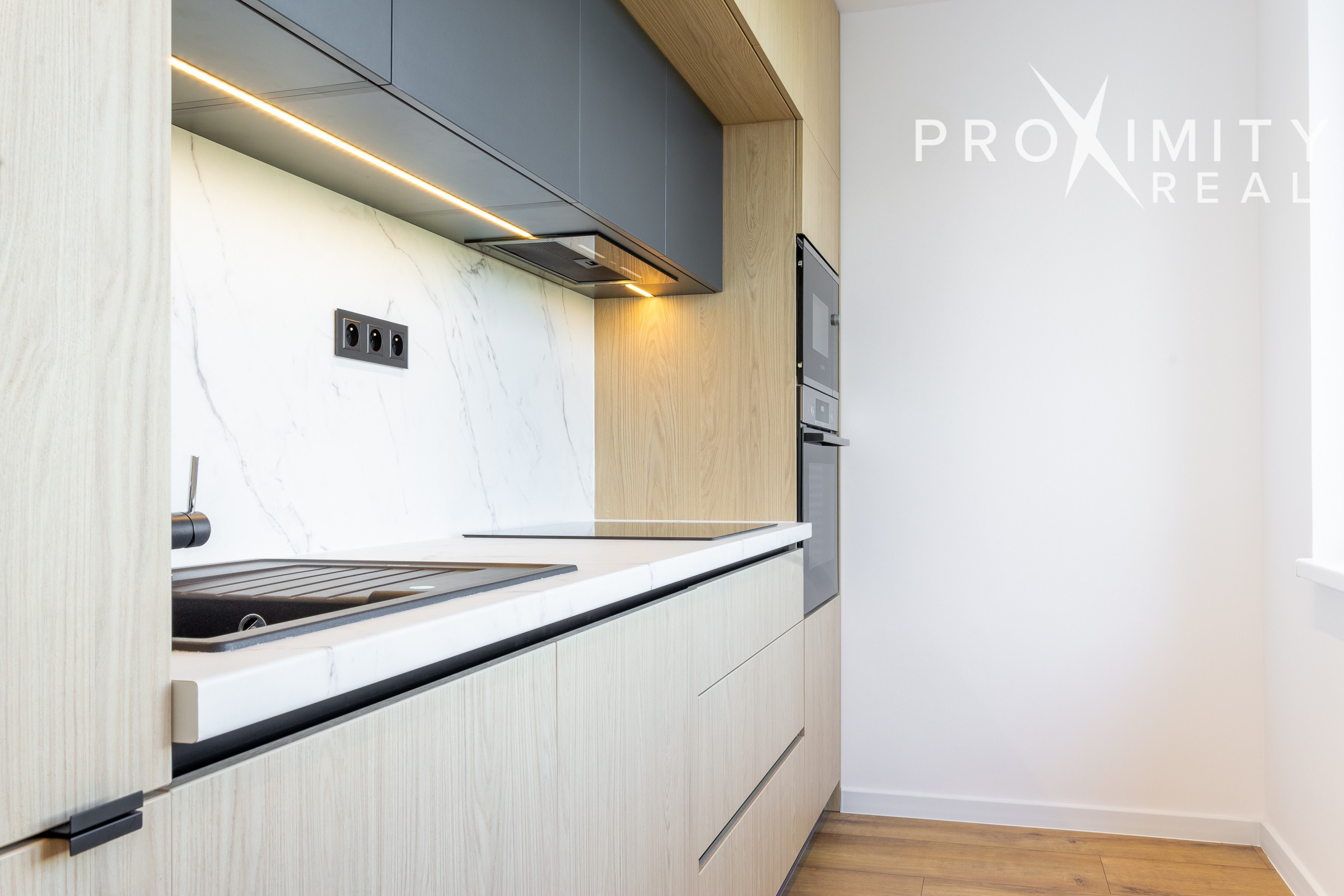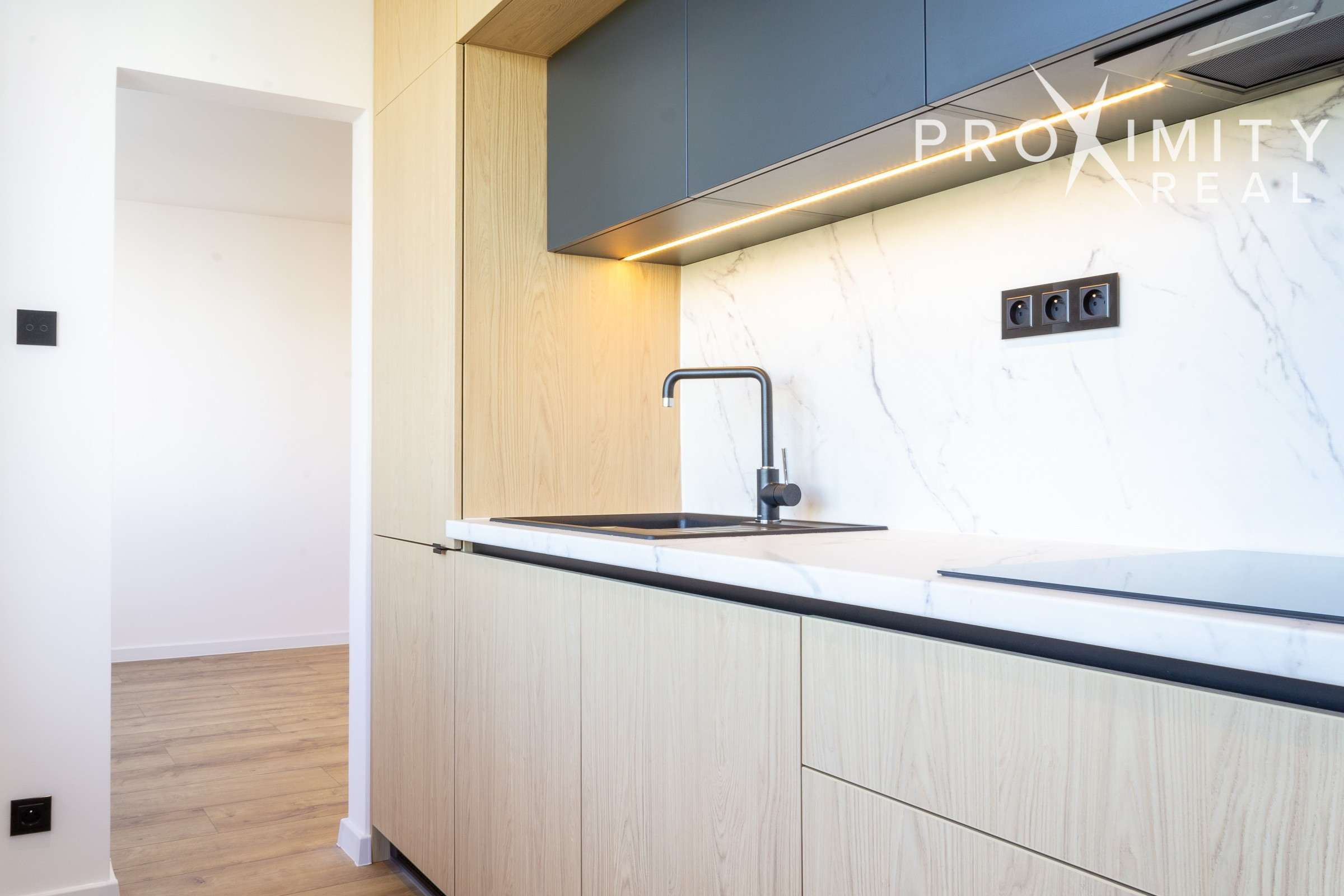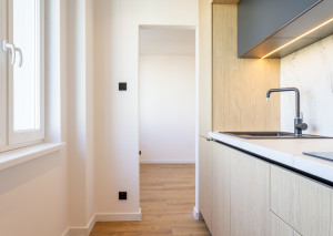 Byt prešiel kompletnou rekonštrukciou. V celom byte boli použité dotykové vypínače a zásuvky v elegantnej čiernej farbe, ktoré esteticky kontrastujú s bielymi lištami a svetlými tónmi stien. V obývacej izbe aj v oboch spálňach sa nachádza centrálne stropné osvetlenie doplnené o dekoratívne podsvietenie pozdĺž okien. Intenzitu aj teplotu svetla možno jednoducho meniť podľa nálady alebo času, čím sa vytvára osobitá atmosféra v každej časti bytu.