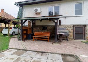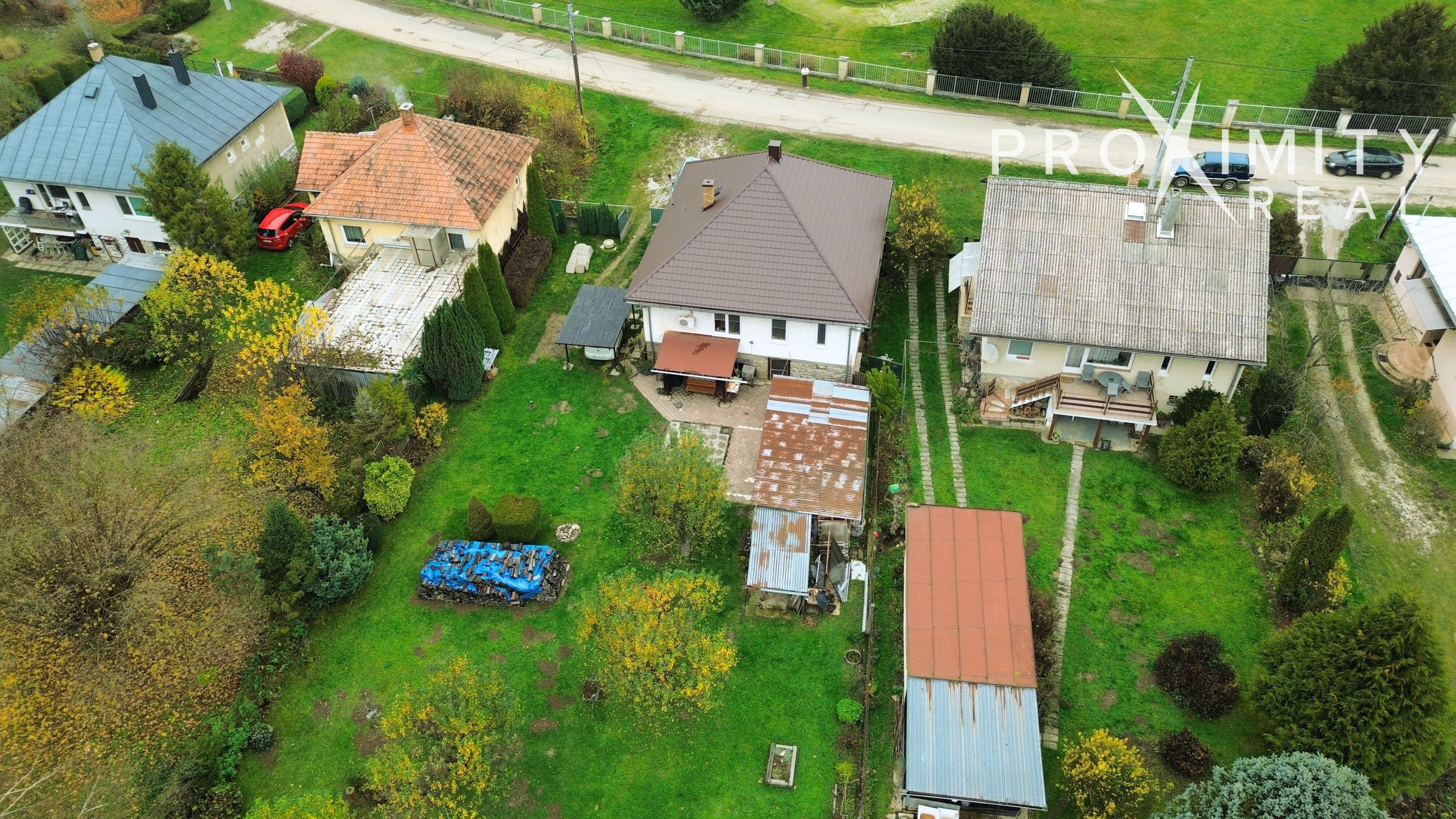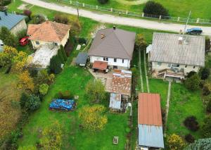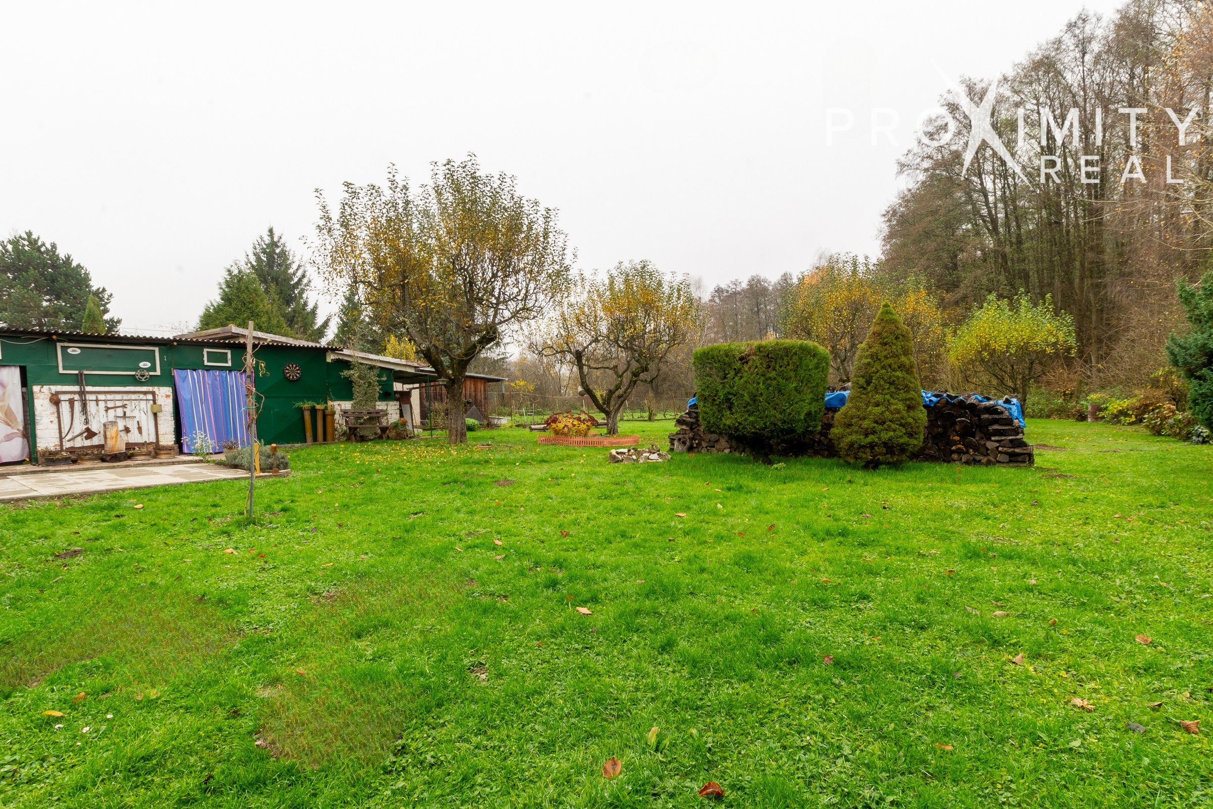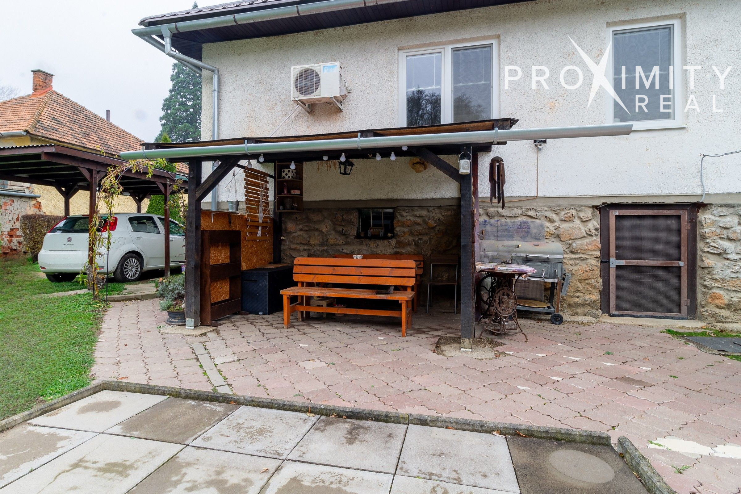 Na pozemku sa nachádzajú dva prístrešky – jeden umiestnený v zadnej časti záhrady, ideálny na pokojné sedenie s výhľadom na zeleň a les, a druhý vedľa domu, ktorý slúži najmä na praktické parkovanie.