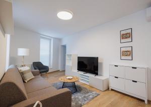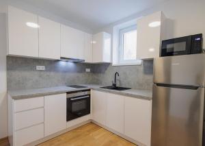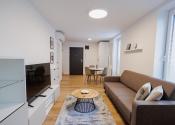 V spálni sa nachádza manželská posteľ a šatník, kúpeľňa je vybavená sprchovacím kútom, toaletou a kombinovanou práčkou so sušičkou. Kuchynská linka je so vstavanými spotrebičmi, v obývacej izbe je gauč, TV a konferenčný stolík.