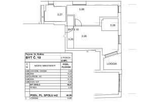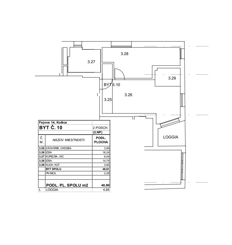 Byt má rozlohu 46,61 m², k bytu prislúcha balkón s rozlohou 4,65 m² a skladová miestnosť (kopka) na prízemí bytového domu s rozlohou 2,29 m², čo predstavuje spolu 53,55m2.