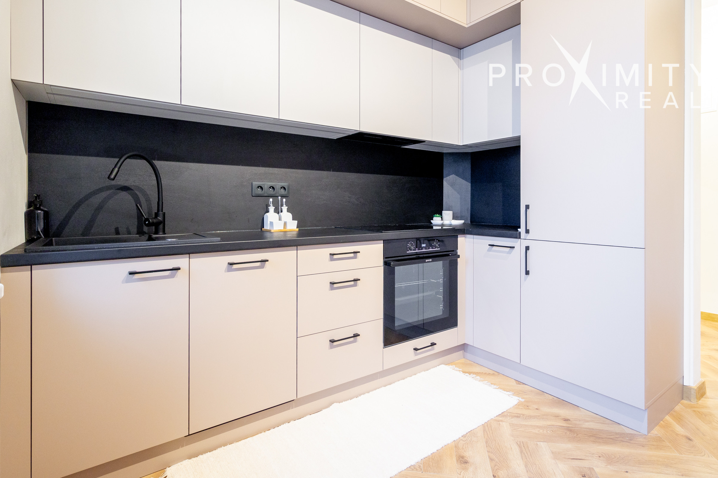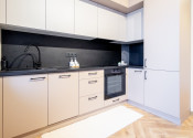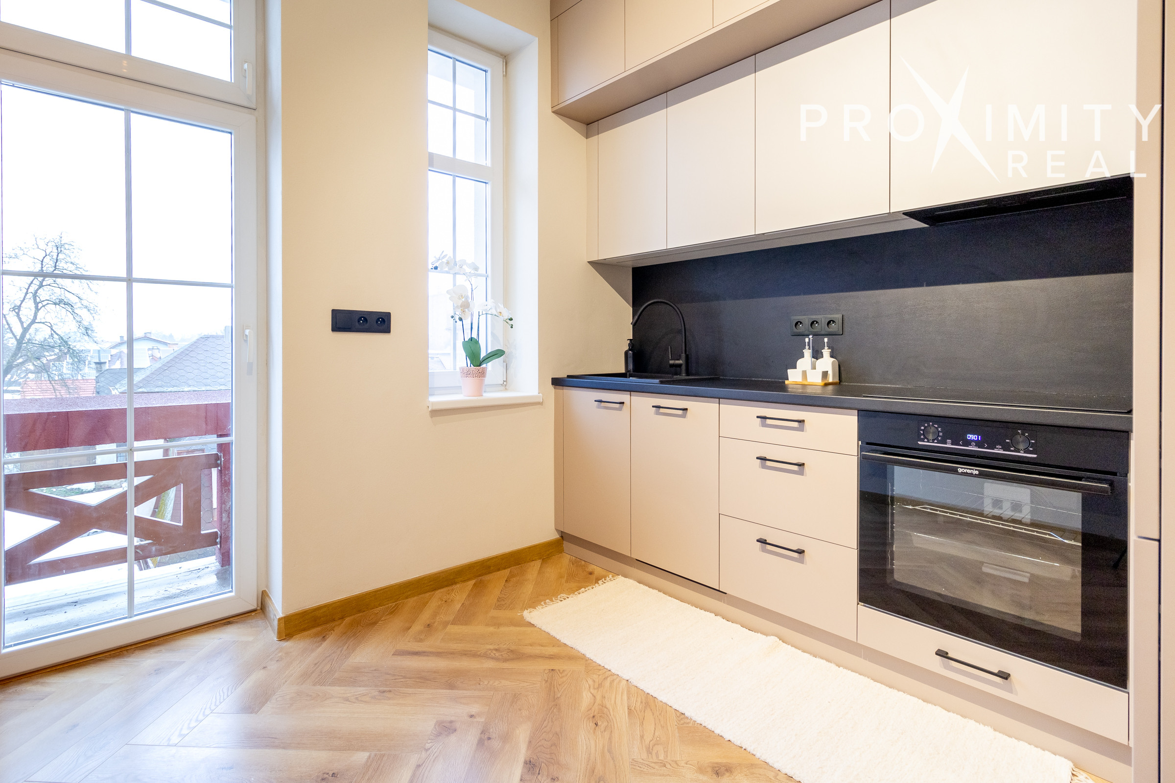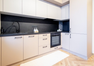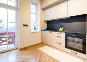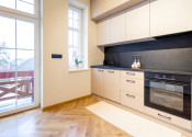 V kuchyni nájdete novú, modernú, na mieru robenú kuchynskú linku so vstavanými spotrebičmi značky Gorenje - chladnička, umývačka riadu, elektrická rúra, indukčná varná doska a digestor s odsávaním do komína. Z kuchyne je východ na balkón s príjemným výhľadom na okolité rodinné domy.