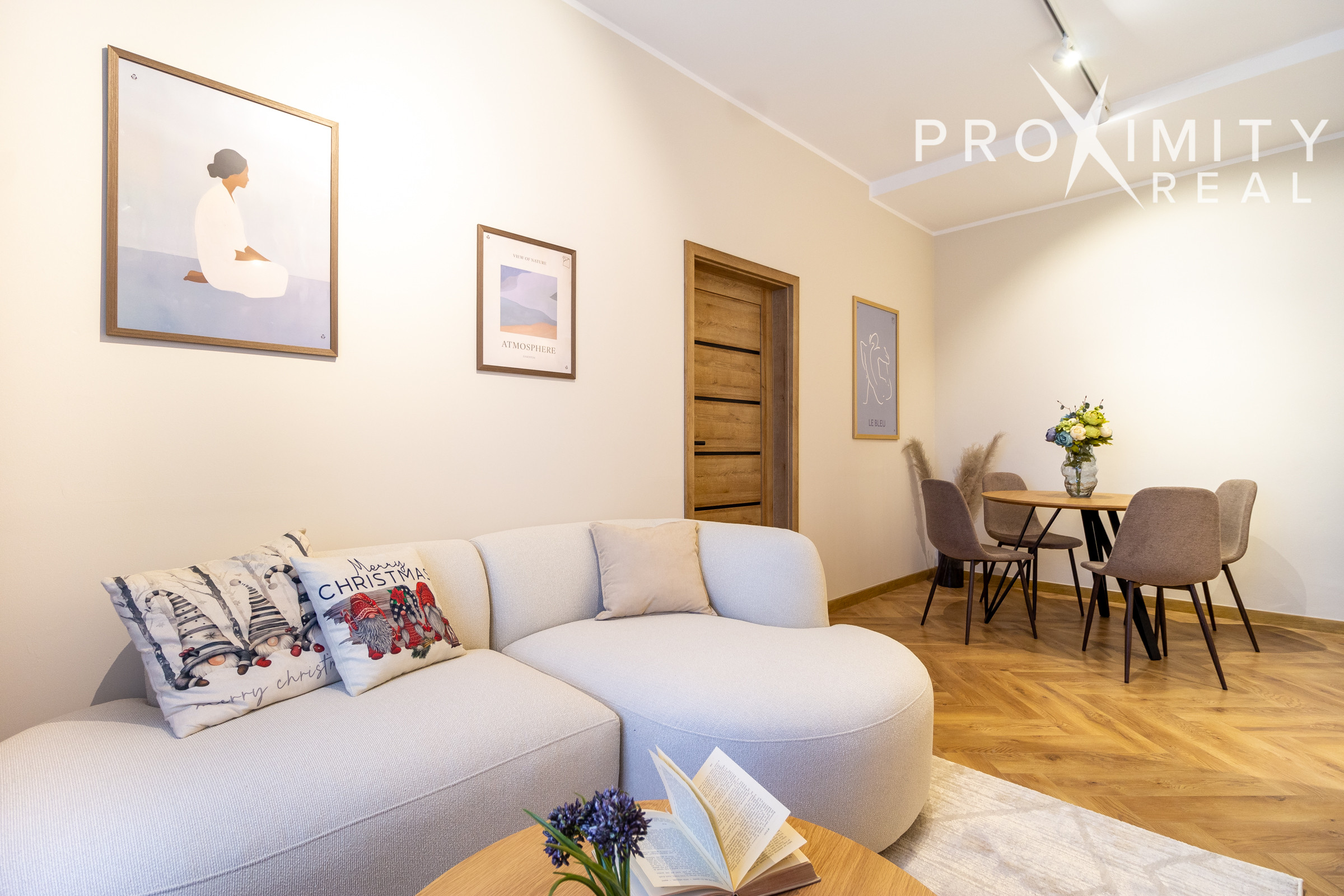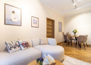 Obývacia izba je spojená s jedálenskou častou, kde krásu a útulnosť dodáva rohový gauč, moderný nábytok, televízna stena na mieru a jedalenský stôl so stoličkami.