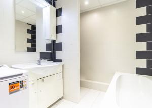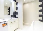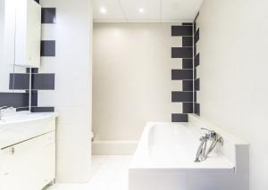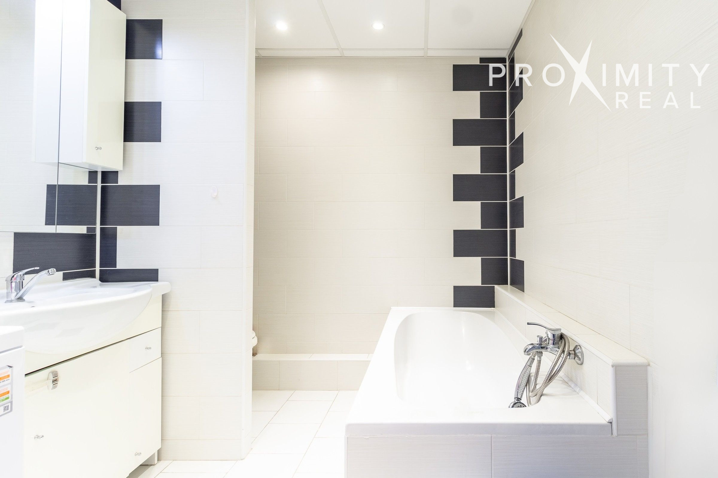Z priestrannej chodby je vstup do kúpeľne spojenej s WC, kde sa nachádza vaňa aj práčka. Veľkým benefitom bytu je aj pivnica a špajza umiestnená priamo pred bytom, čo výrazne zvyšuje úložný komfort – výhoda, ktorá sa pri prenájmoch vidí len zriedka.