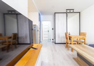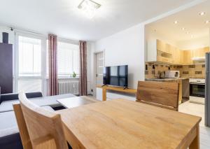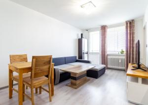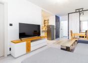Obývacia izba je kompletne zariadená – k dispozícii je pohodlný gauč, televízny stolík so širokouhlým televízorom, konferenčný stolík, jedálenský stôl s dvomi stoličkami a praktická vstavaná rolldorová skriňa, ktorá zabezpečuje dostatok úložného priestoru.