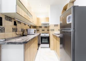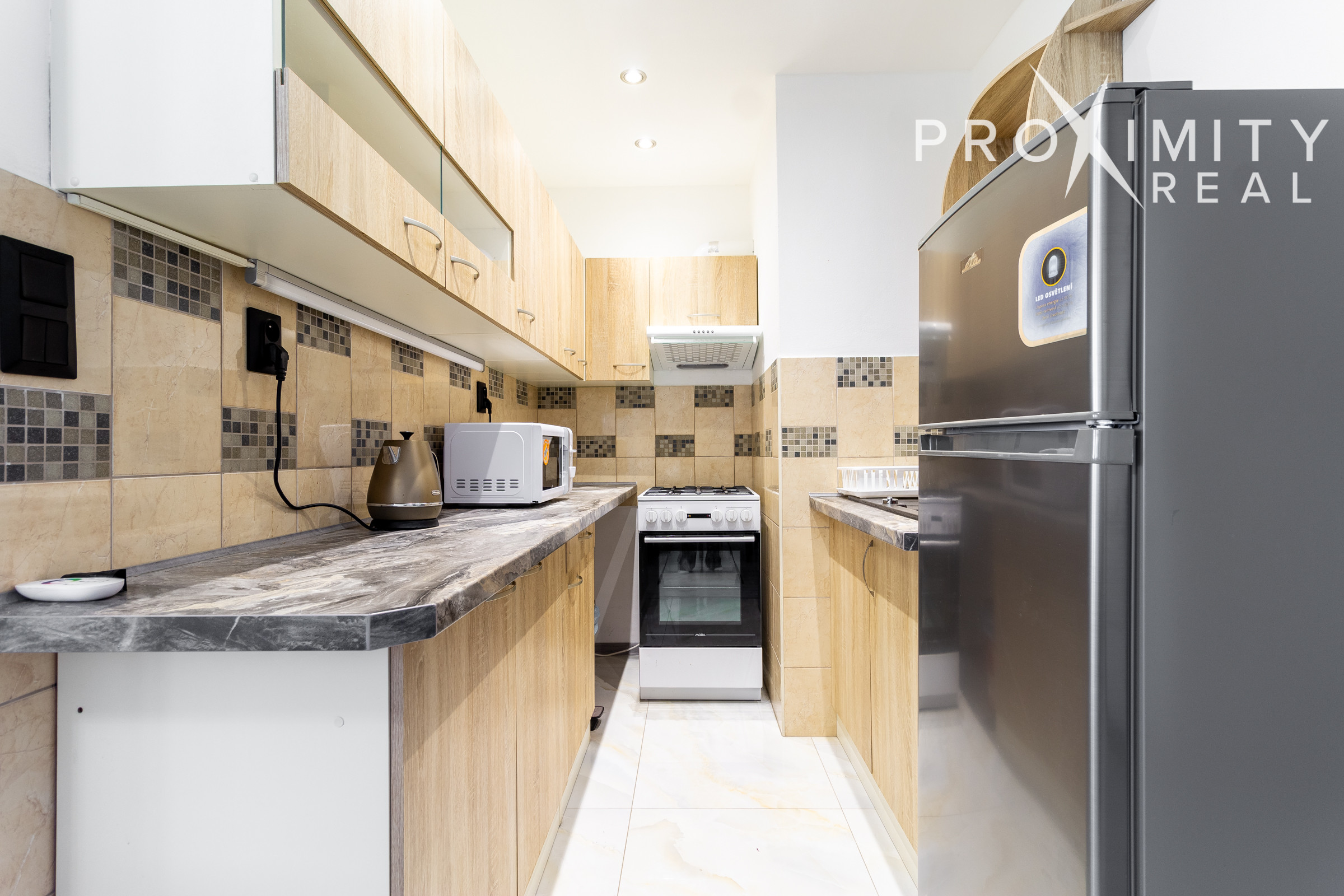 Kuchyňa je riešená funkčne a ponúka dostatok pracovnej plochy aj úložných možností po oboch stranách. Je vybavená samostatne stojacou chladničkou, rúrou, sporákom a mikrovlnnou rúrou, vďaka čomu je byt pripravený na okamžité užívanie bez ďalších investícií.