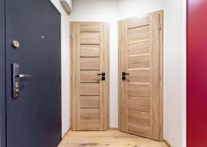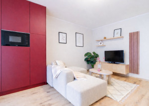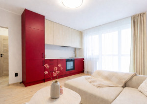 Celý byt, vrátane nábytku na mieru je ladený do elegantnej kombinácie béžovej a burgundi, čo mu dodáva nadčasový a útulný charakter.