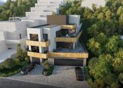 • obklad zábradlí terás kompozitnými hliníkovými doskami v úprave drevodekór a z ulice podsvietené led pásmi