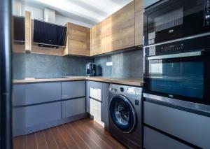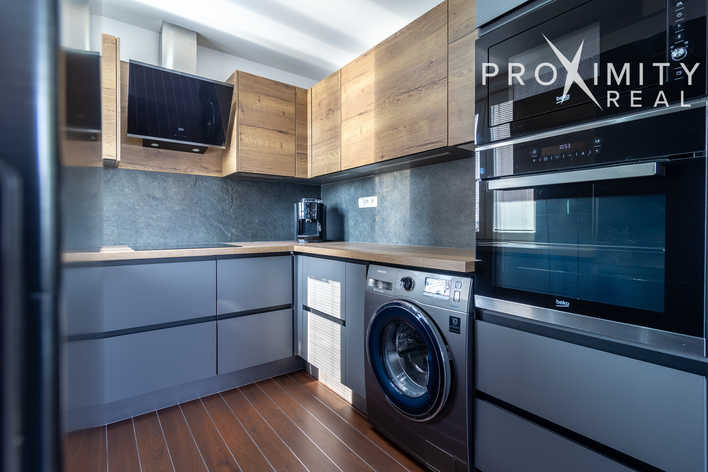Kuchyňa s bonusom: Kuchynská linka na mieru so vstavanými spotrebičmi disponuje vlastným oknom – v tomto type bytu mimoriadne žiadaný prvok, ktorý zabezpečuje prirodzené svetlo a vetranie.
