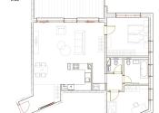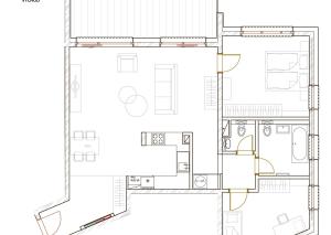 Dominantou je vzdušná obývacia izba prepojená s kuchyňou a jedálenskou časťou, ktorá vytvára prirodzený priestor pre rodinný život aj spoločenské stretnutia. Dve samostatné spálne poskytujú dostatok súkromia a komfortu.